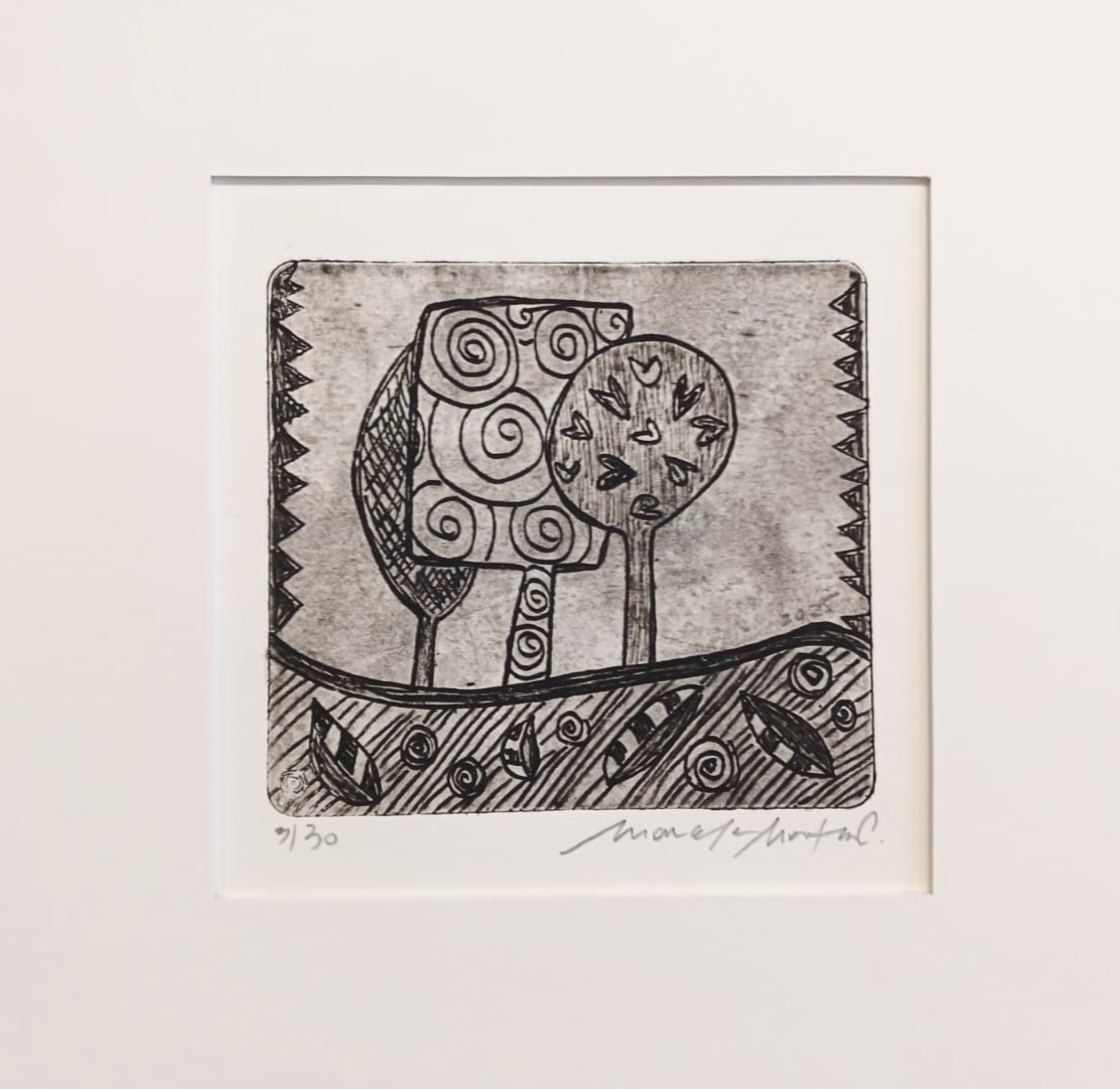 Título: «Árbol de té» Técnica: Eco Grabado Dimensiones: 25 x 25 cm Grabado + Passepartout Autor: Marcela Matus Año: 2025