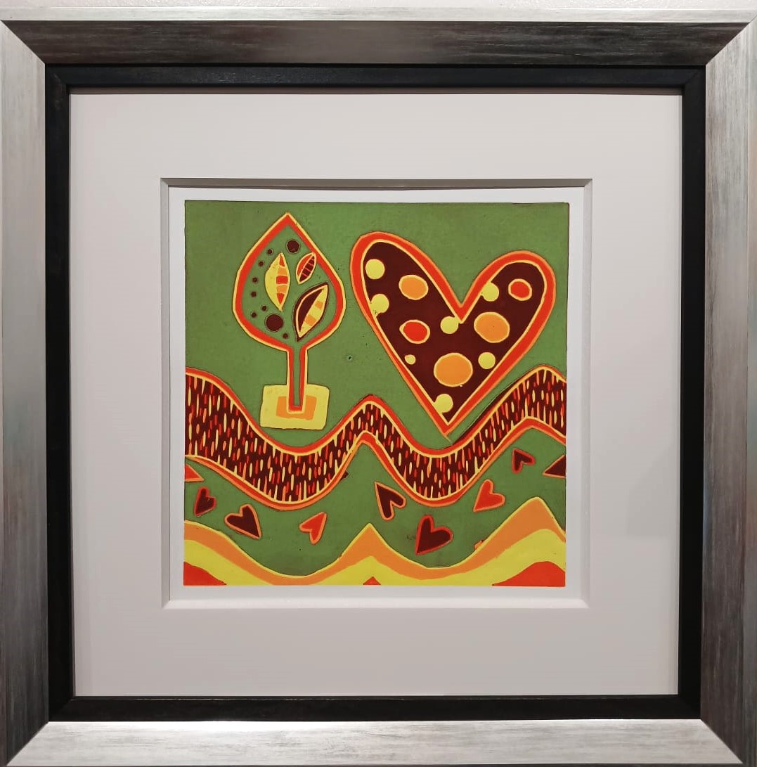 Título: «Cultivos de Amor» Técnica: Xilografía Color Dimensiones: 48 x 48 cm Marco: Plateado + Negro Autor: Marcela Matus Año: 2026