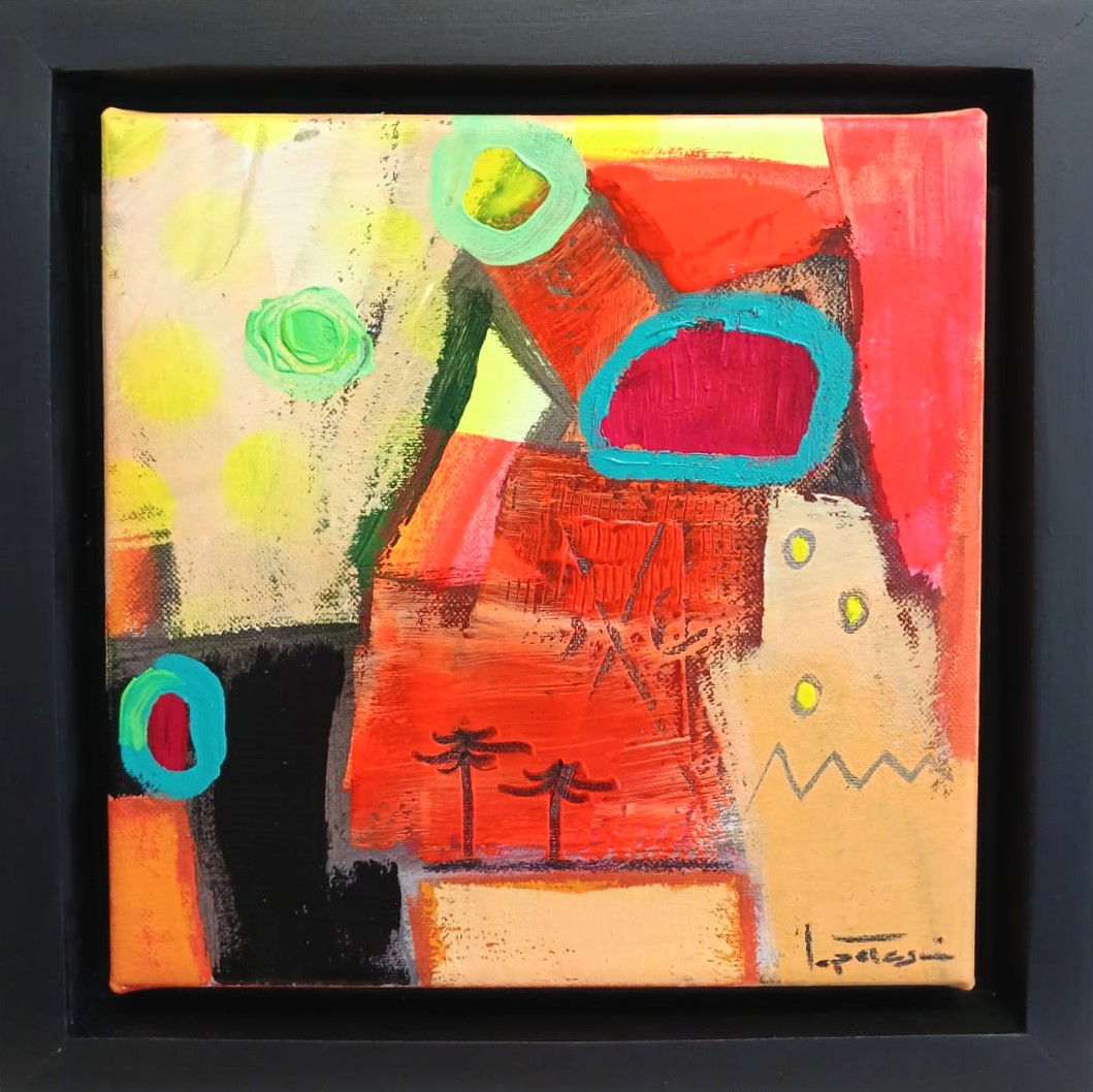 Titulo: Energía Vital 2 Técnica: Mixta sobre tela Dimensiones: 25 x 25 cm. Marco: Oregón – Color negro Autor: Pablo Lopetegui Año: 2025