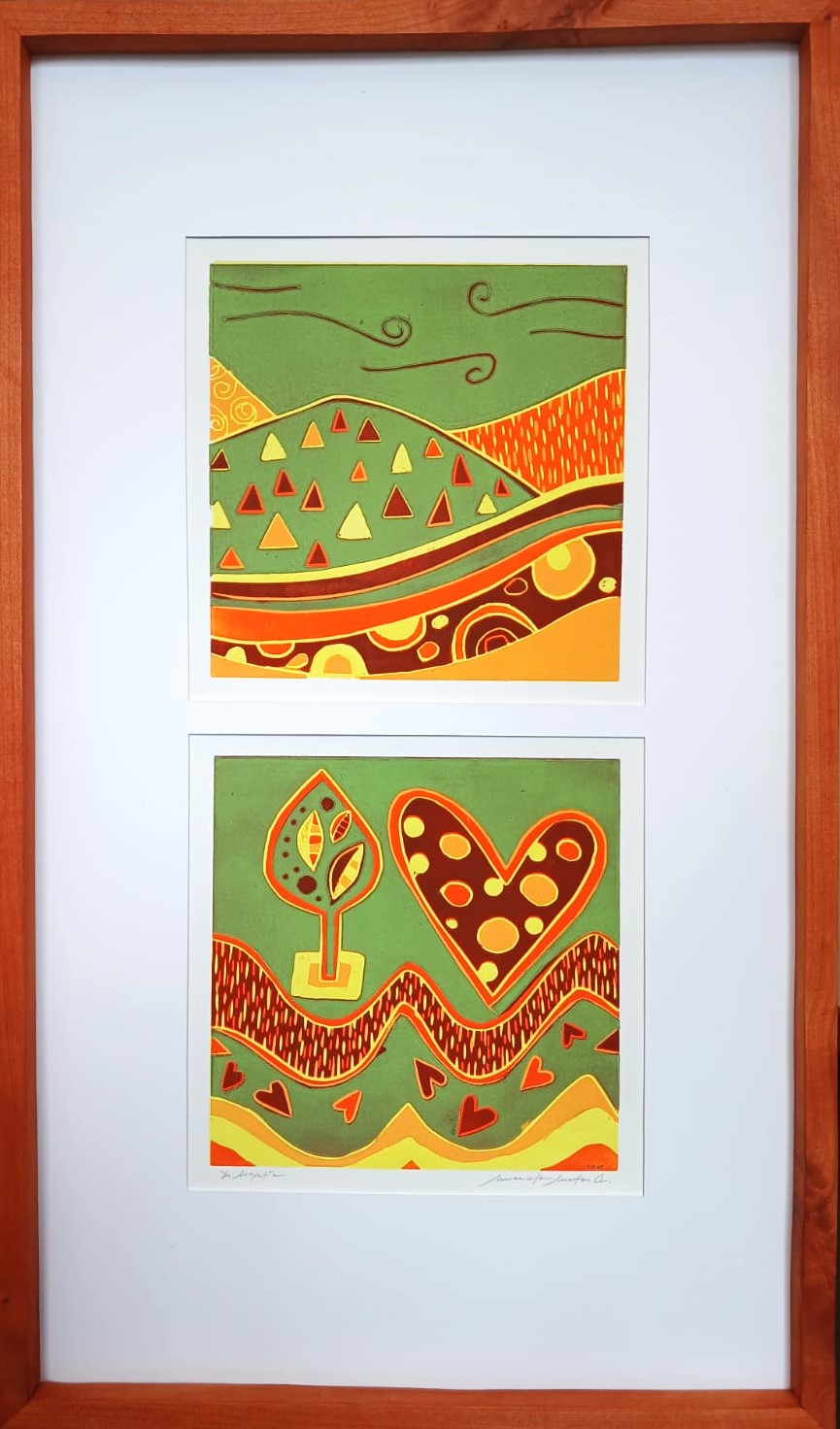 Título: «Guía de montaña» Técnica: Xilografía Color Dimensiones: 85 x 50 cm Marco: Raulí Autor: Marcela Matus Año: 2025