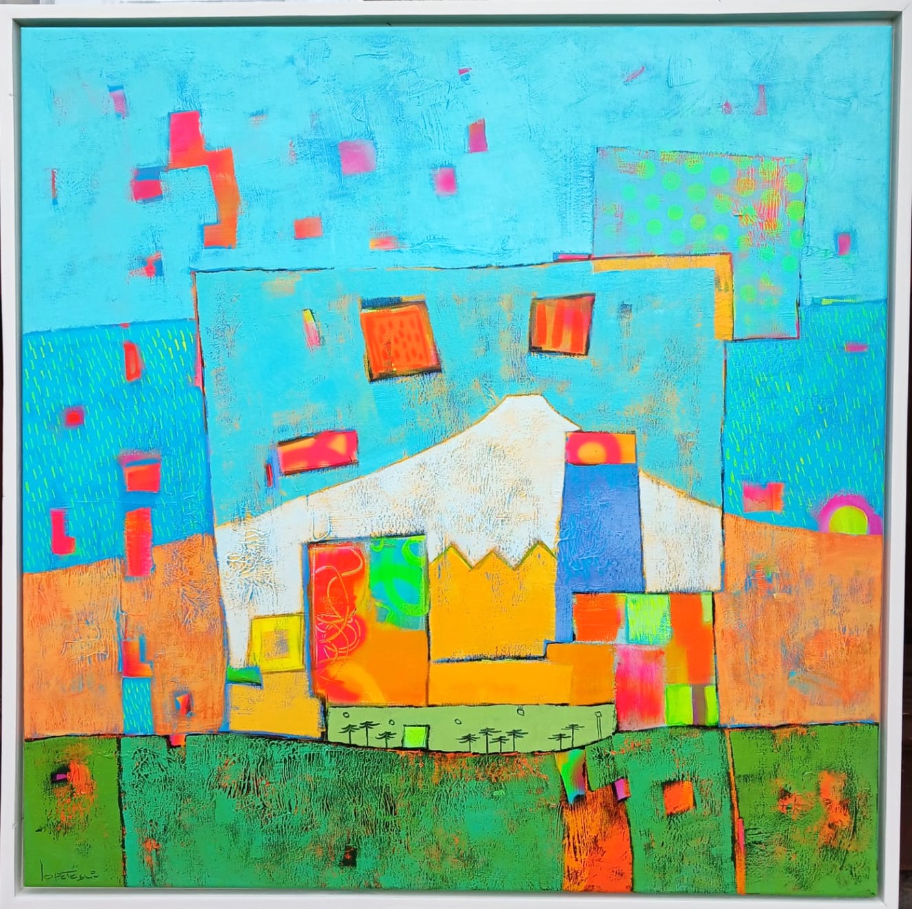 Titulo: «Miradas al volcán» Técnica: Mixta sobre tela Dimensiones: 105 x 105 cm. Marco: Oregón – Color Blanco Autor: Pablo Lopetegui