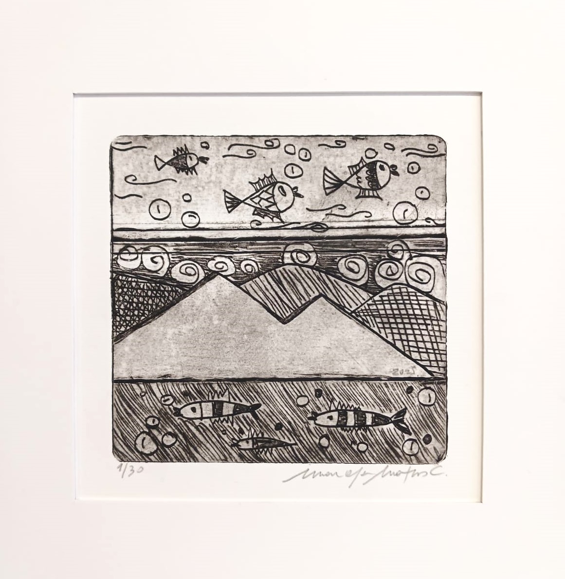 Título: «Mundos Infinitos» Técnica: Eco Grabado Dimensiones: 25 x 25 cm Grabado + Passepartout Autor: Marcela Matus Año: 2025