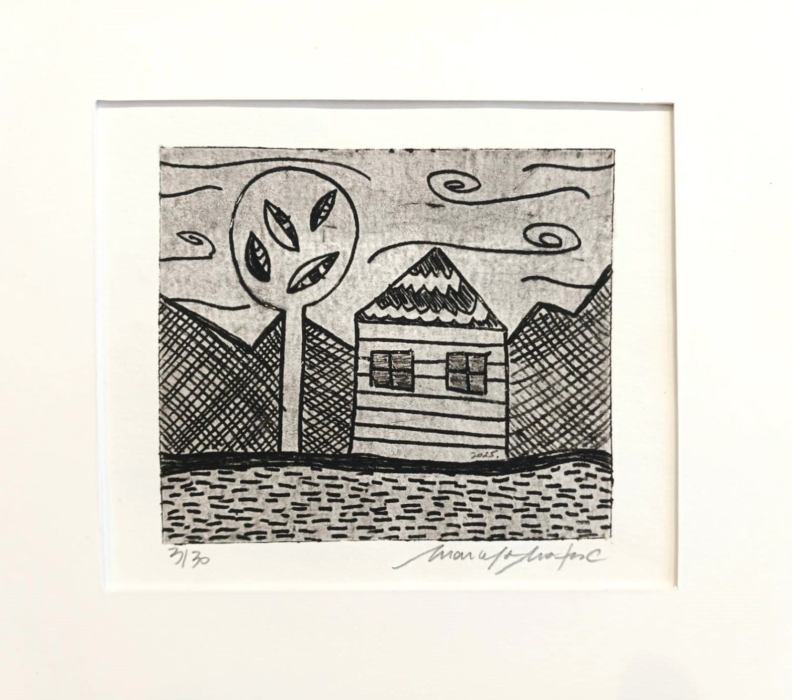 Título: «Refugio» Técnica: Eco Grabado Dimensiones: 25 x 25 cm Grabado + Passepartout Autor: Marcela Matus Año: 2025
