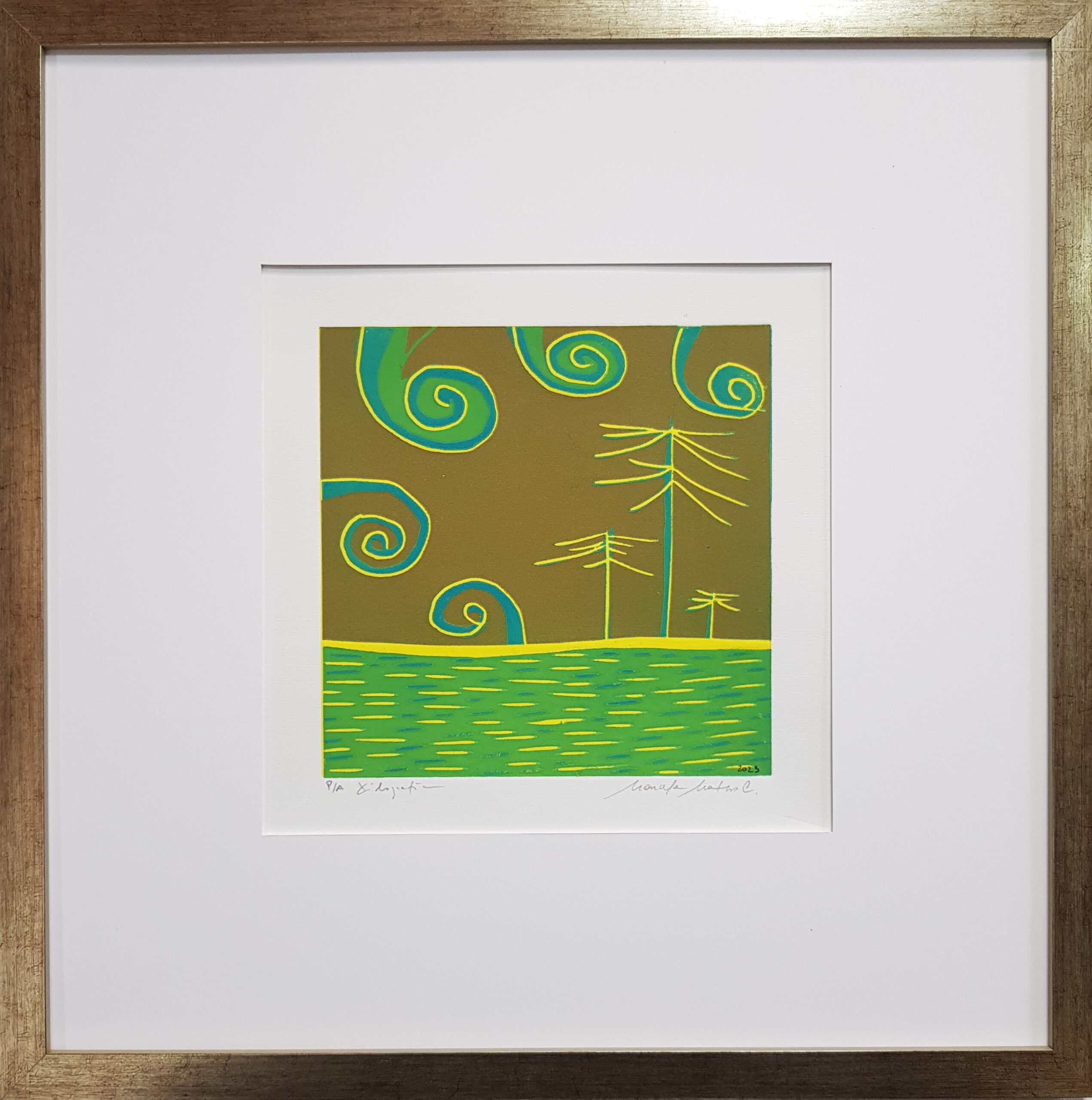 Titulo: «Terra II» Técnica: Xilografía Color Dimensiones: 45 x 45 cm Marco: Dorado Autora: Marcela Matus Año: 2023
