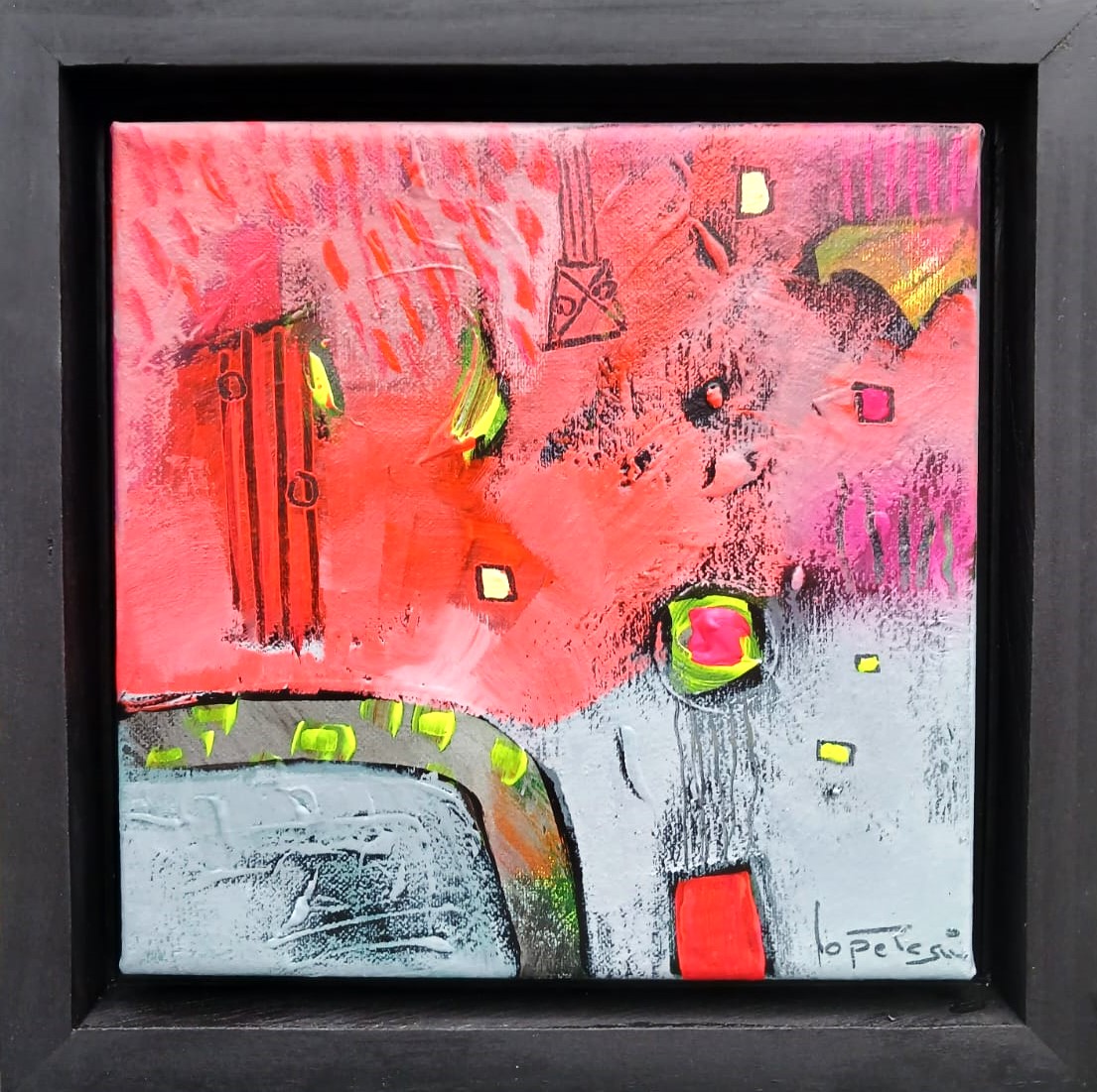 Titulo: Transformación III Técnica: Mixta sobre tela Dimensiones: 25 x 25 cm. Marco: Oregón – Color negro Autor: Pablo Lopetegui Año: 2025