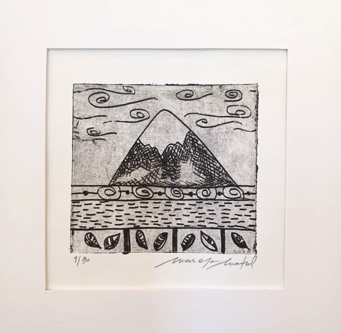 Título: «Volcano» Técnica: Eco Grabado Dimensiones: 25 x 25 cm Grabado + Passepartout Autor: Marcela Matus Año: 2025